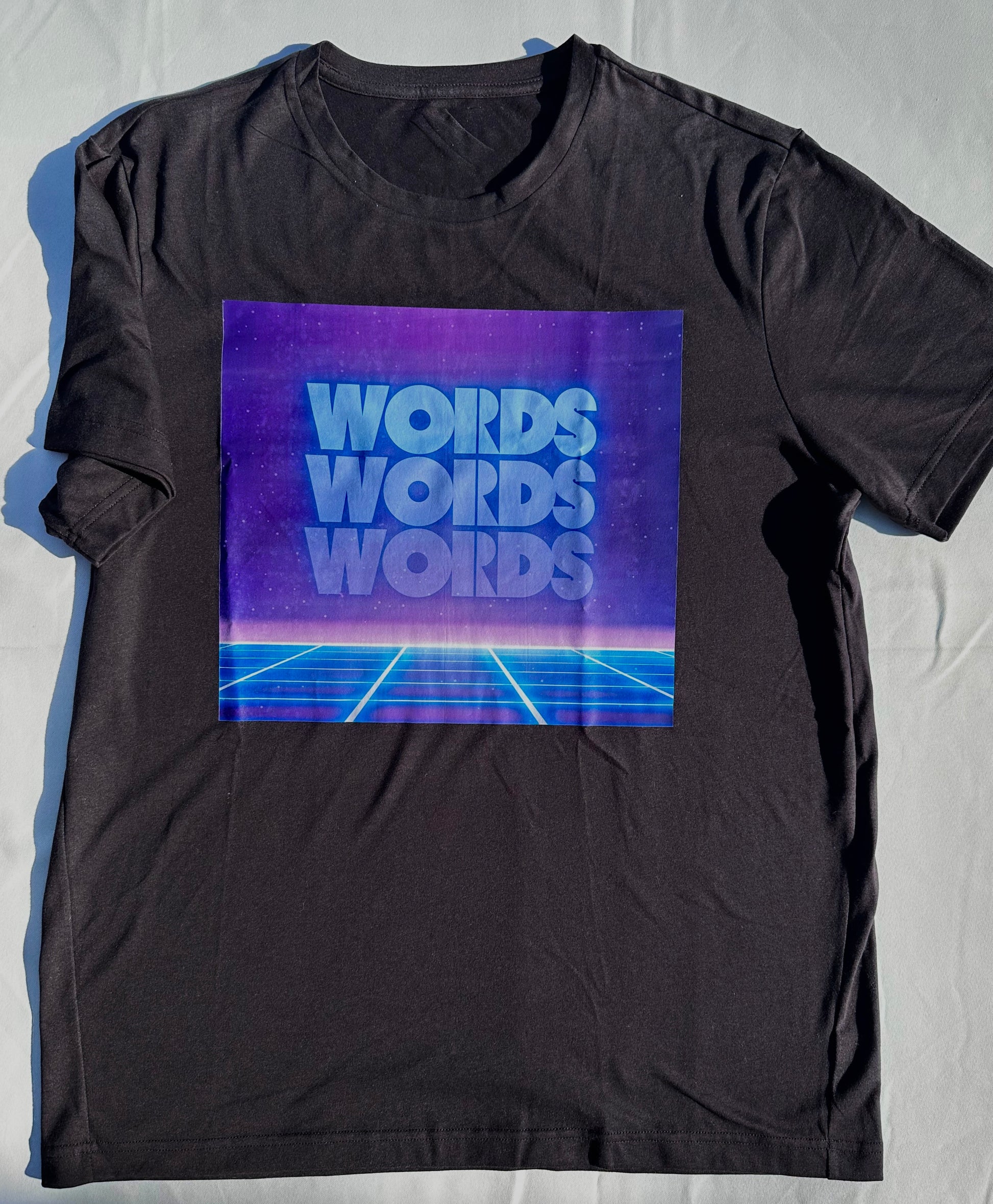 This tee features a retro Tron-style grid with the phrase every slot player knows: “Words Words Words.”